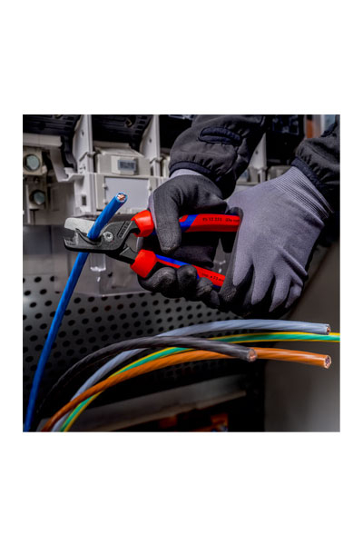 Knipex 95 12 225, yüksek kaldıraçlı bağlantı, uzun saplar ve kesici kenarlar sayesinde kompakt kablo makaslarına kıyasla çok daha hafif kesim yapılabilir.